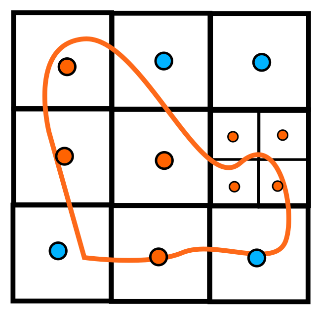 Now imagine we generate the grid cells with a spatial tree instead of a simple grid (it can be a kd-tree, a quadtree, etc):