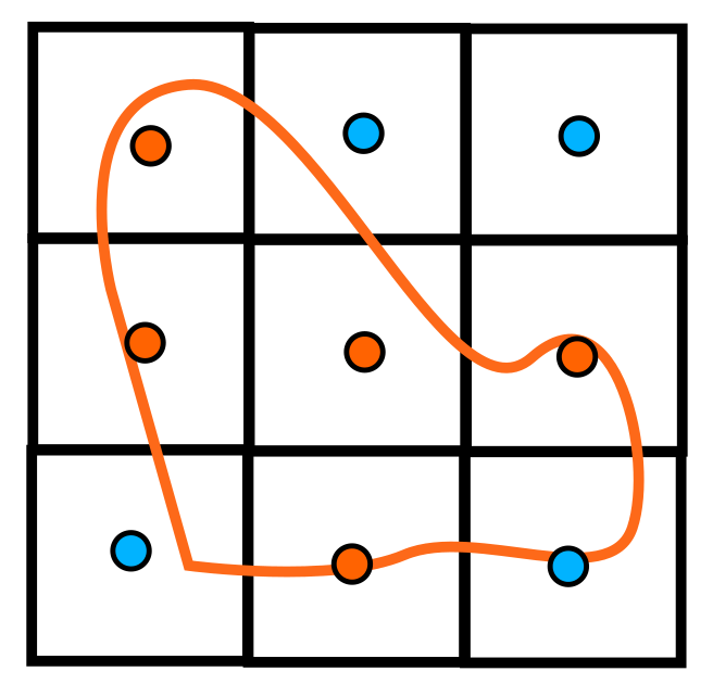 Look at this grid. Each cell stores a list of the curve segments that intersect it. Cells also keep track of whether the center is inside (orange dots) or outside (blue dots) the polygon.